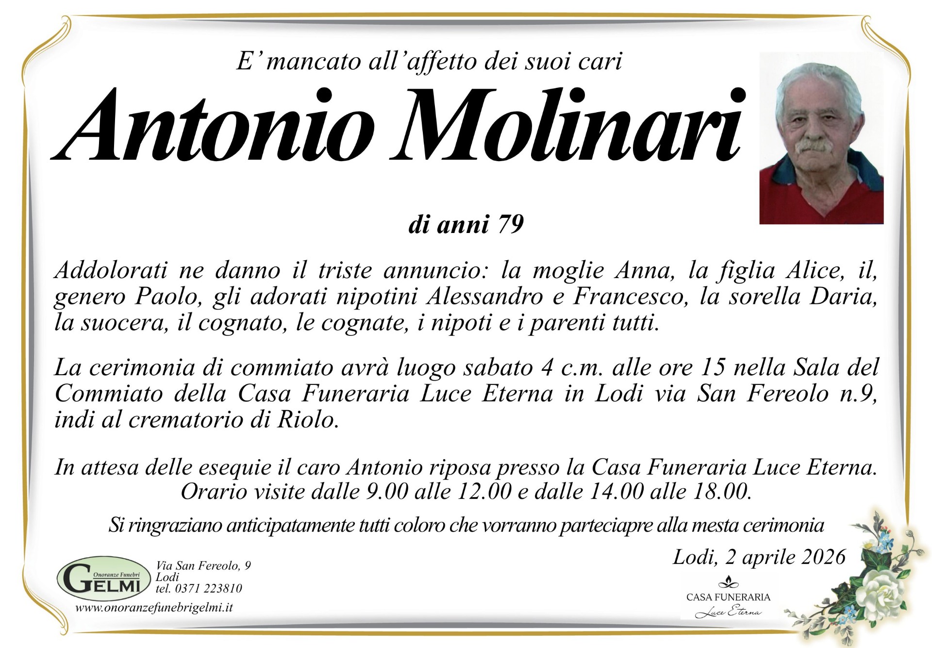 I funerali si svolgeranno in Lodi sabato 4 c.m. alle ore 15.00