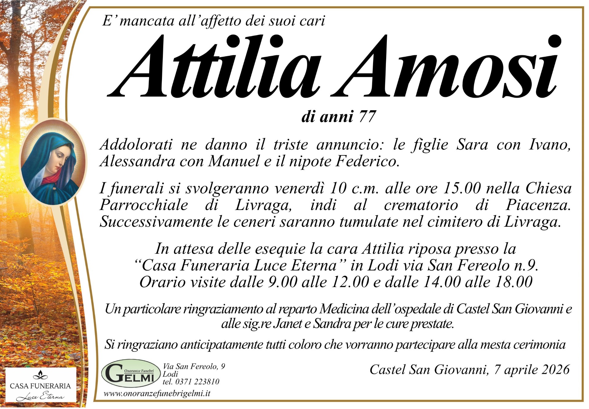 I funerali si svolgeranno in Livraga venerdì 10 c.m. alle ore 15.00
