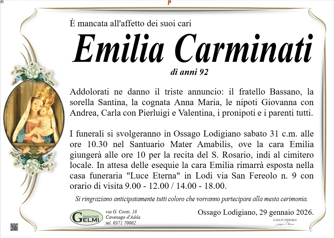 I funerali si svolgeranno in Ossago Lodigiano sabato 31 c.m. alle ore 10.30.
