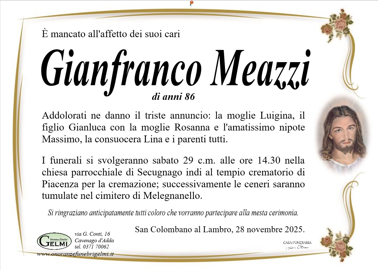 I funerali si svolgeranno in Secugnago sabato 29 c.m. alle ore 14.30