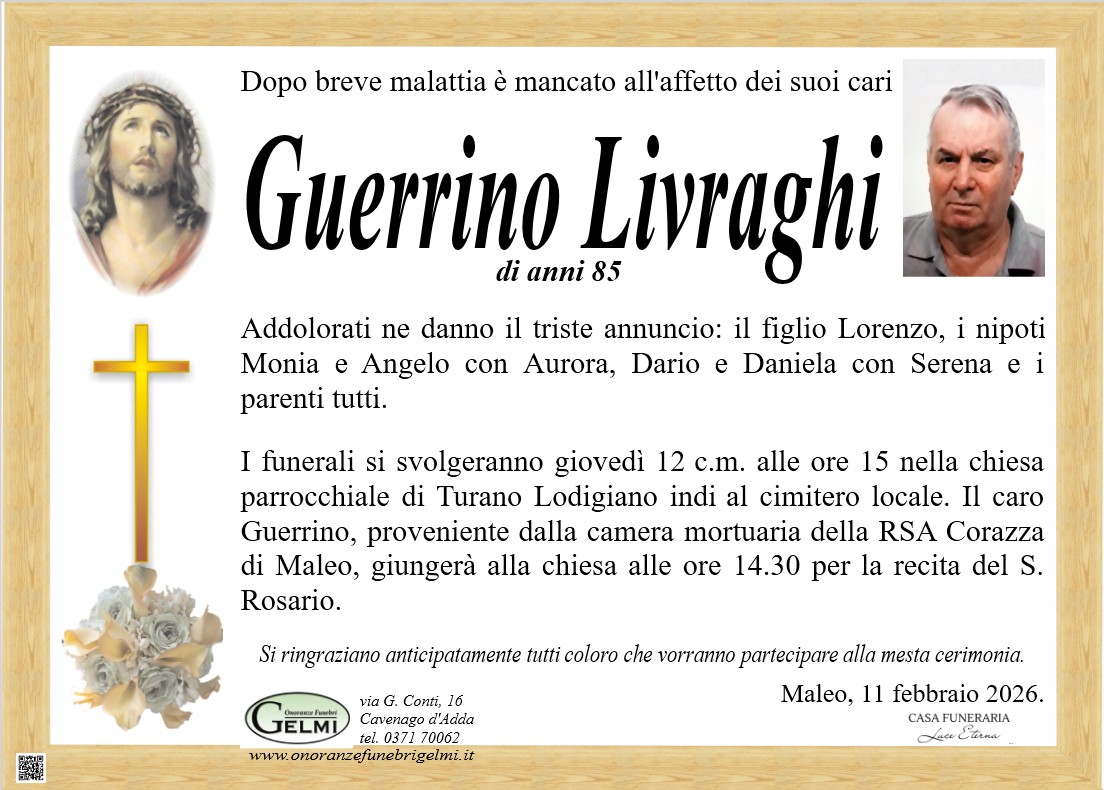 I funerali si svolgeranno in Turano Lodigiano giovedì 12 c.m. alle ore 15.00