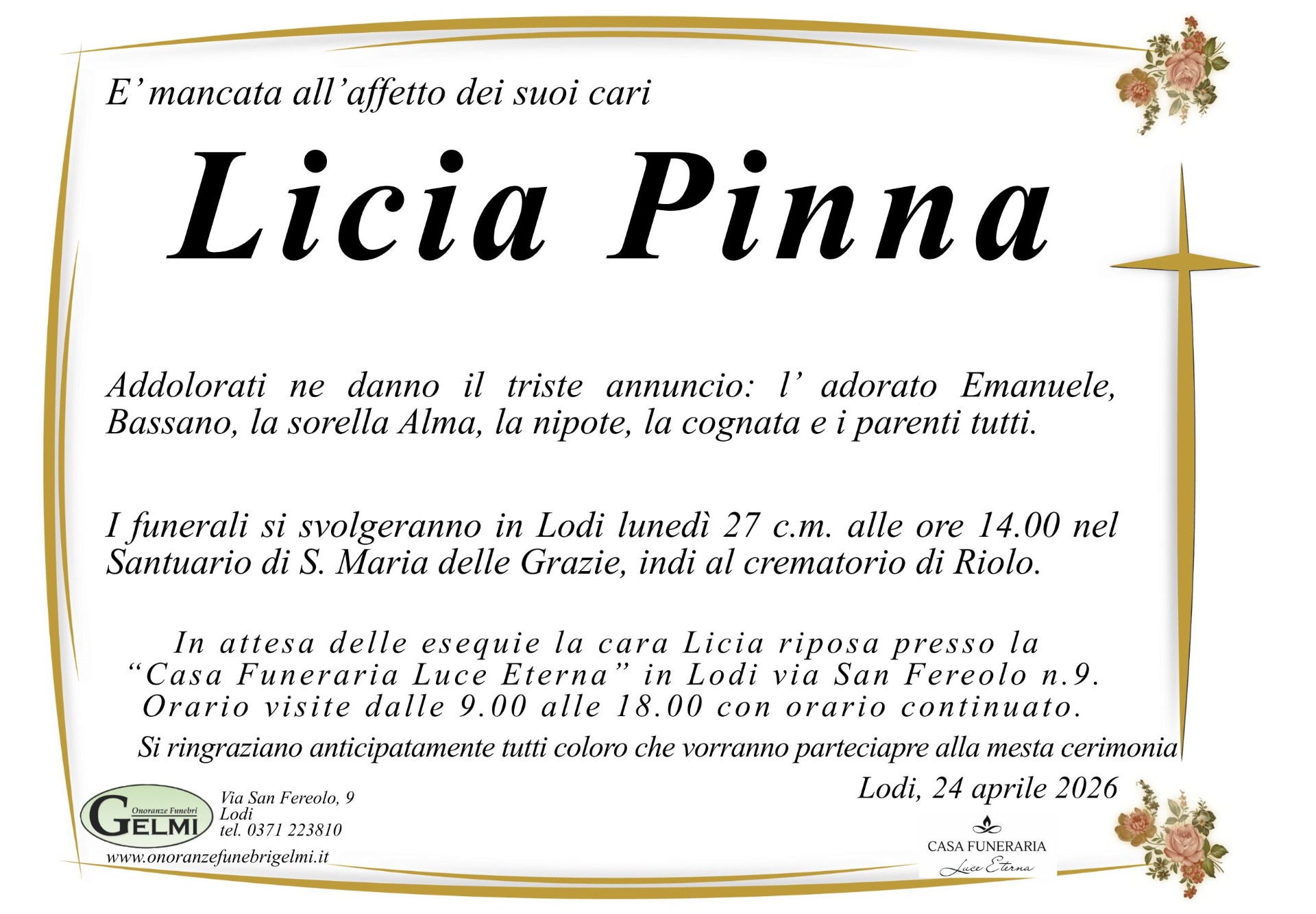 I funerali si svolgeranno in Lodi lunedì 27 c.m. alle ore 14.00