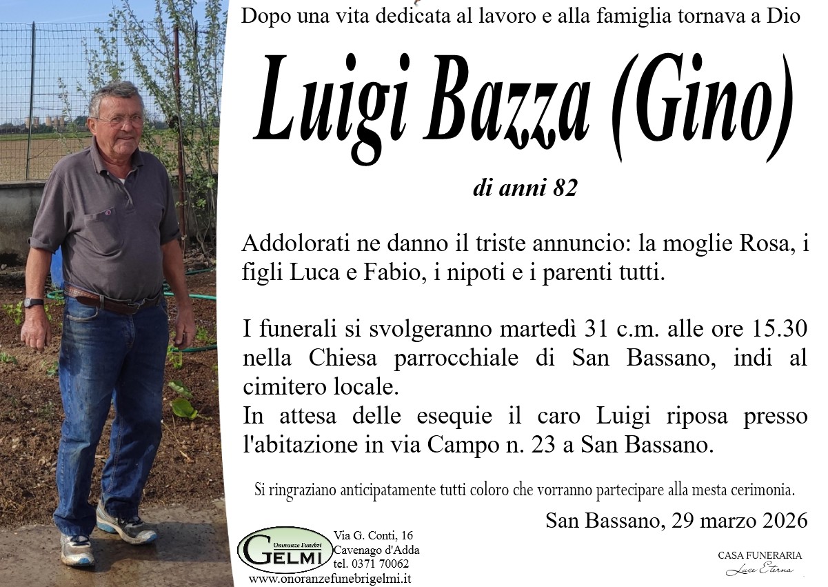 I funerali si svolgeranno in San Bassano martedì 31 c.m. alle ore 15.30