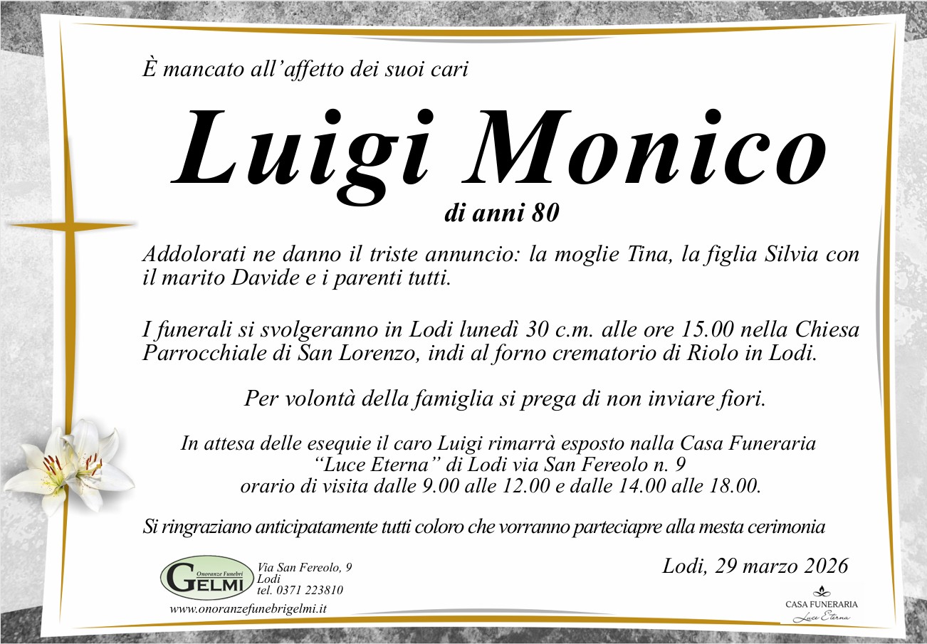 I funerali si svolgeranno in Lodi lunedì 30 c.m. alle ore 15.00.