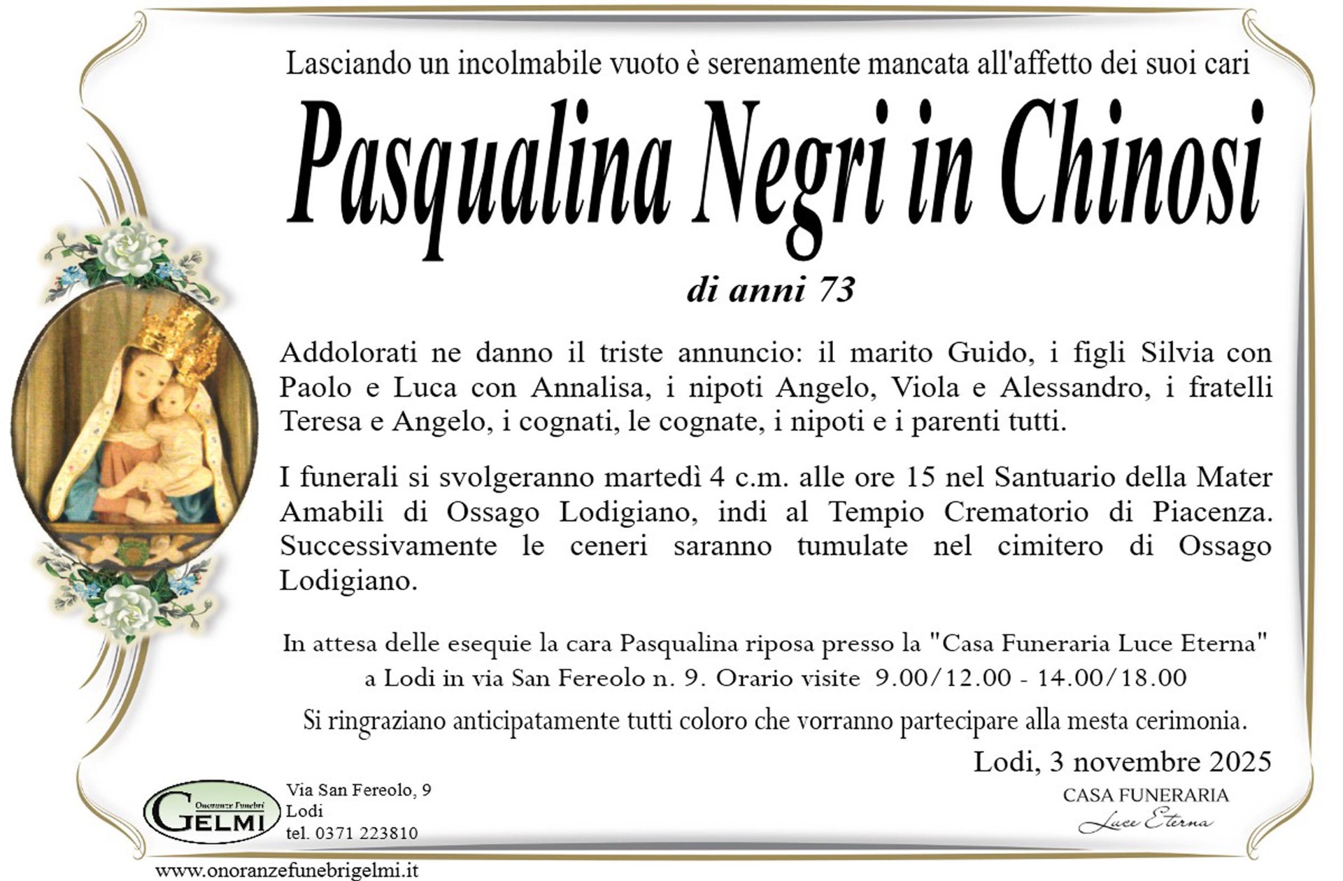I funerali si svolgeranno in Ossago Lodigiano martedì 4 c.m. alle ore 15.00