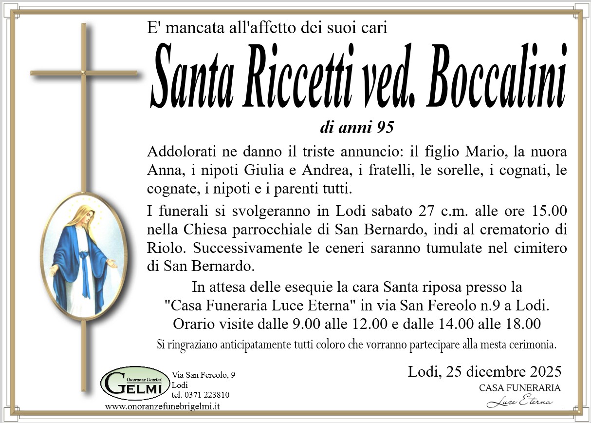 I funerali si svolgeranno in Lodi sabato 27 c.m. alle ore 15.00