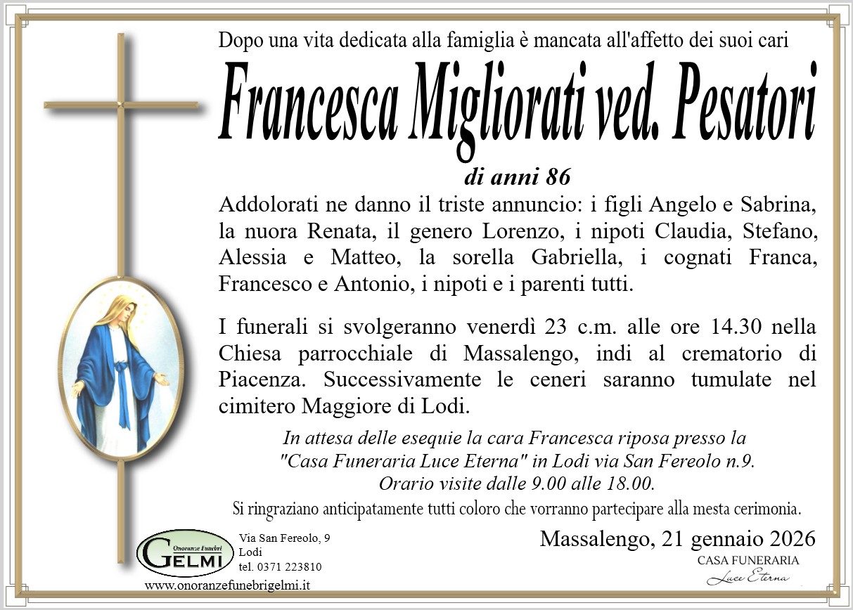 I funerali si svolgeranno in Massalengo mercoledì 24 c.m. alle ore 14.00