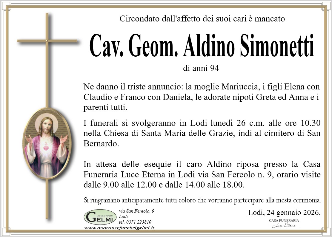 I funerali si svolgeranno in Lodi lunedì 26 c.m. alle ore 10.30