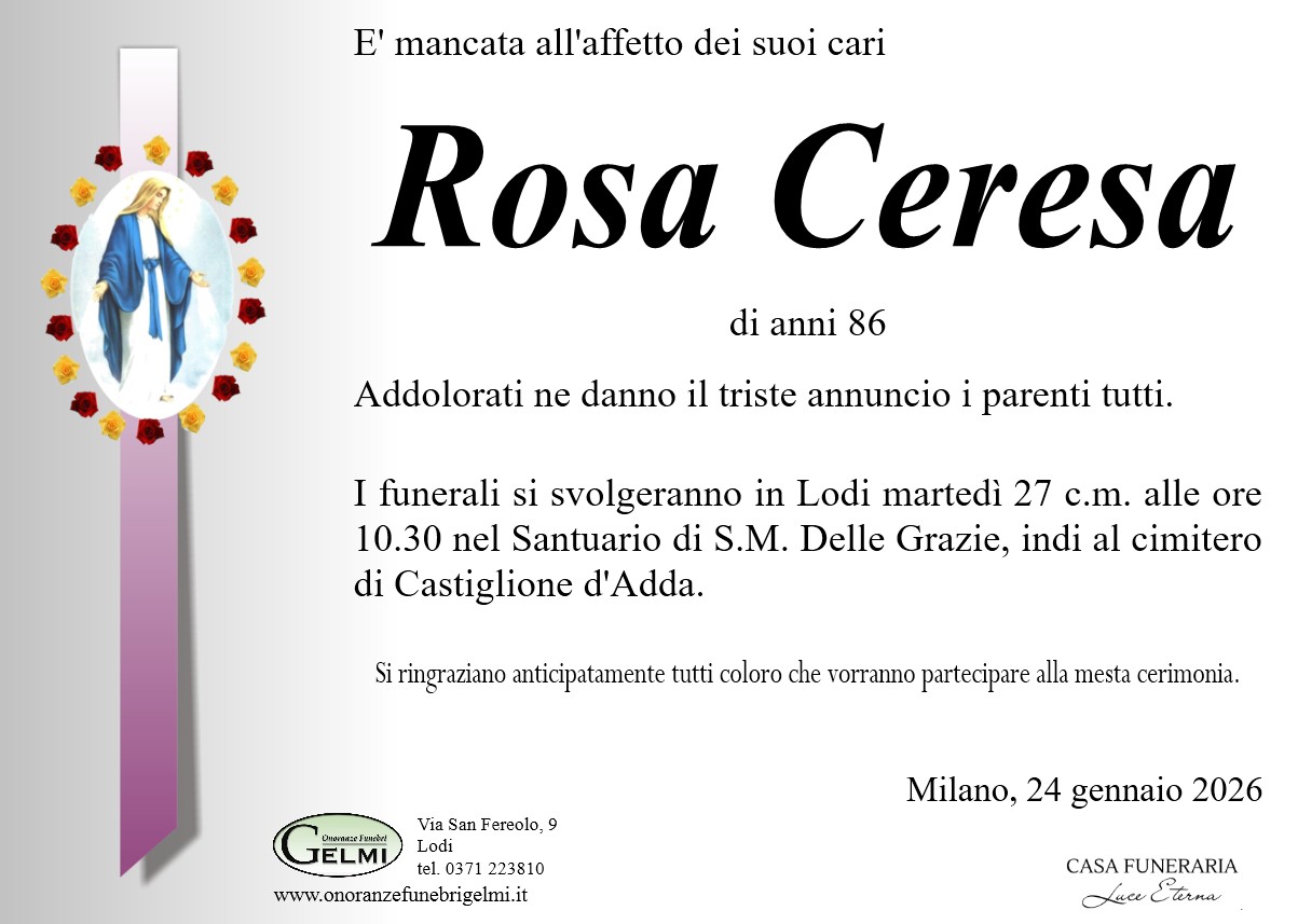 I funerali si svolgeranno in Lodi martedì 27 c.m. alle ore 15.00