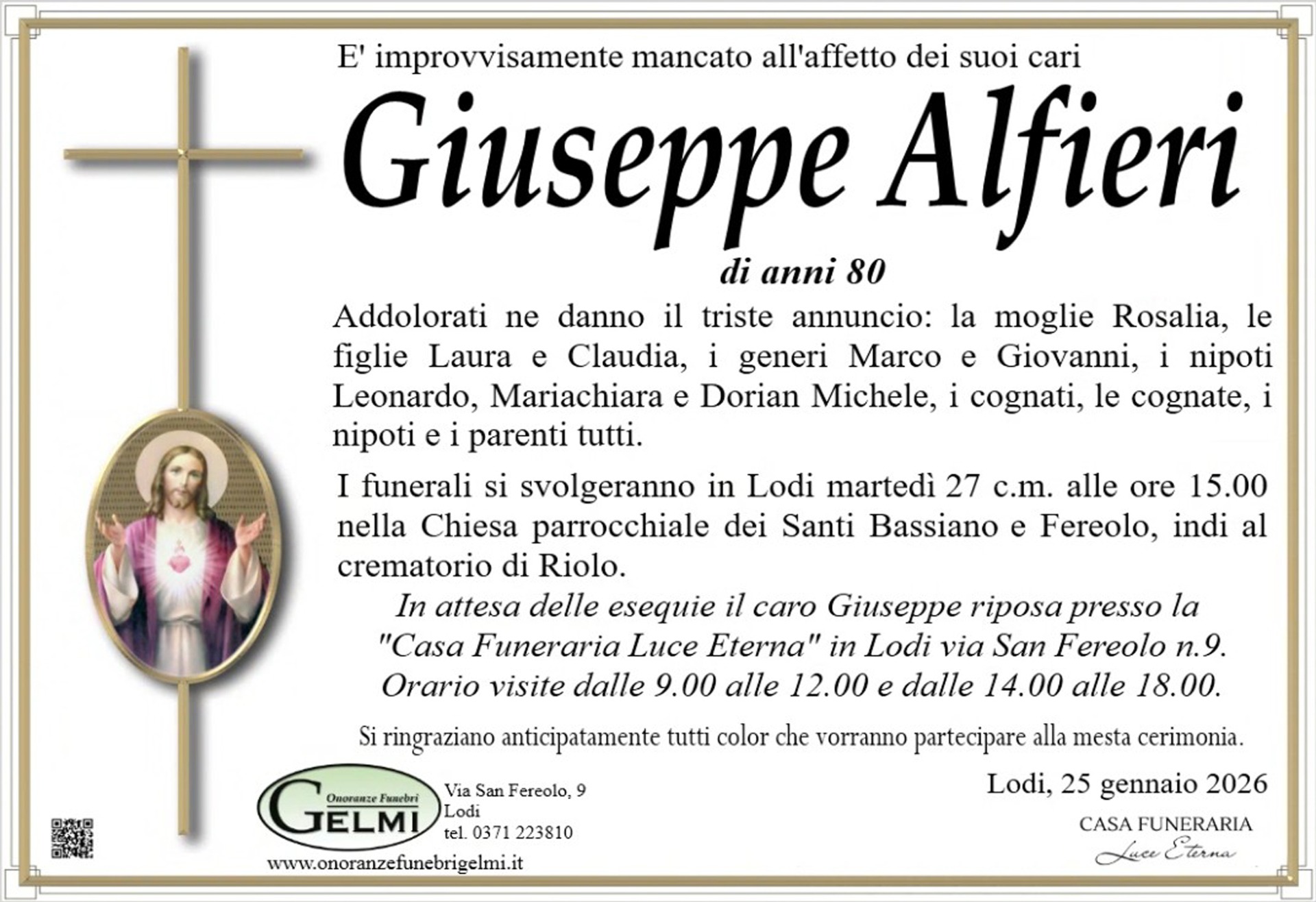I funerali si svolgeranno in Lodi martedì 27 c.m. alle ore 10.30